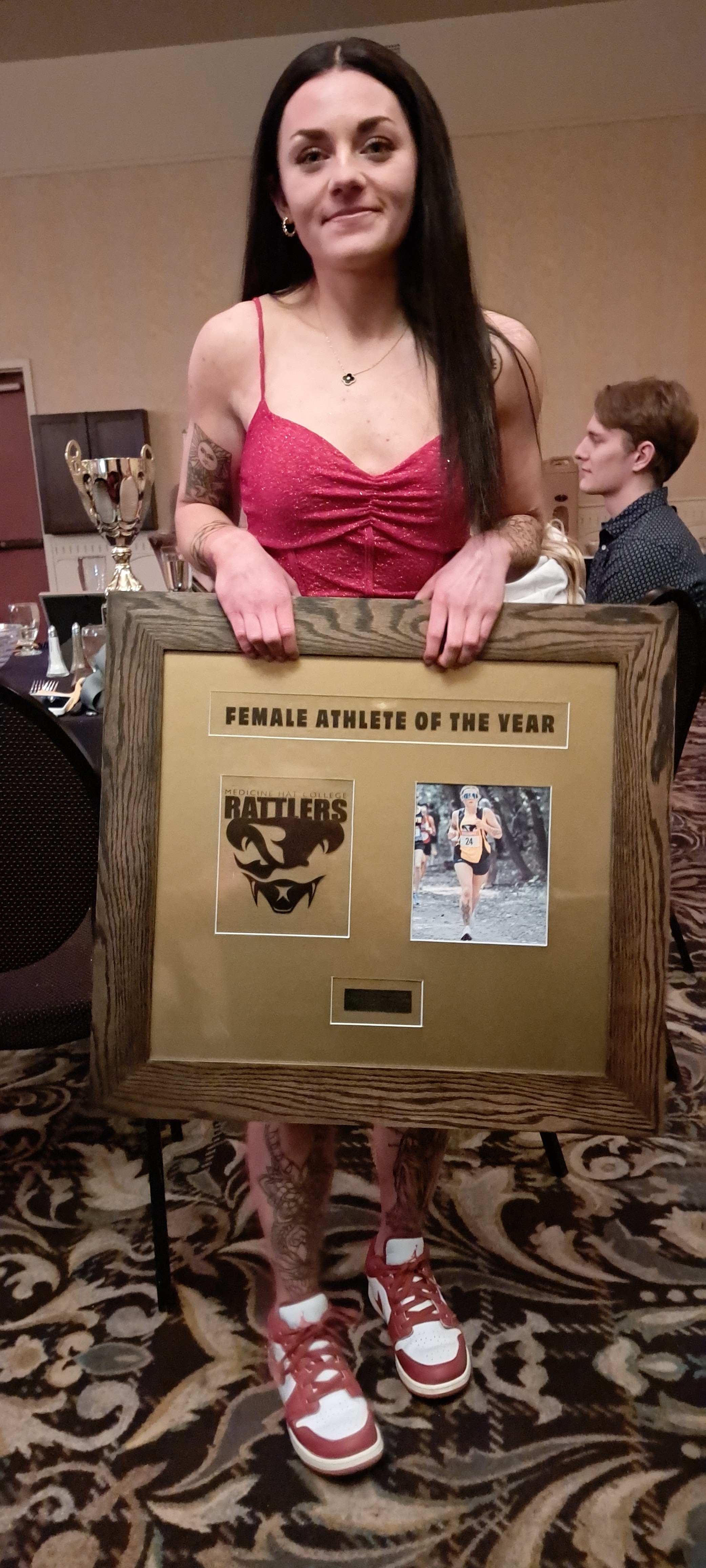 Third-year nursing student Madison Scrimger was named 2024-25 MHC Rattlers Female Athlete of the Year on Friday night at the 53rd Annual Rattlers Awards banquet. During this past season, Scrimger was named to the ACAC All Conference Team in both cross-country and indoor track, and she earned a full set of ACAC individual medals – Gold in the 3000m, Silver in the 1500m, and bronze in the 6 km cross country. She also achieved CCAA All Academic status.